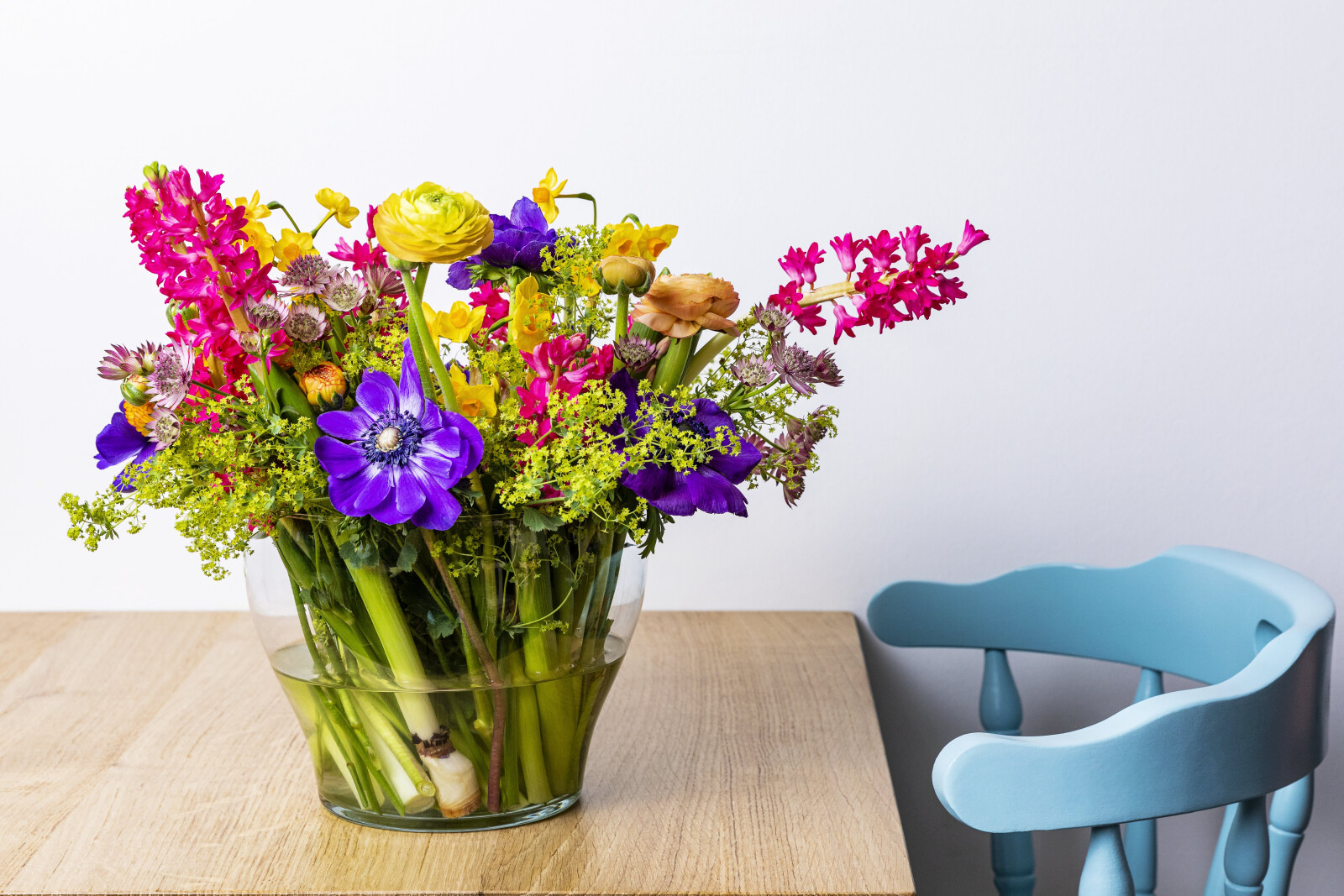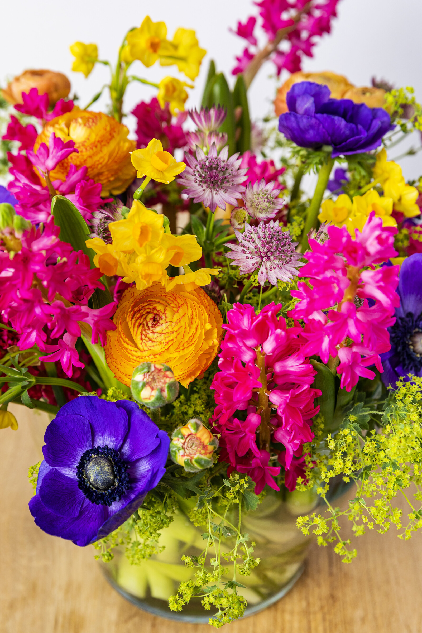 Hyacinthus is a lush flower, characterised by dense, colourful flower clusters on a sturdy stem. This flower is always an eye-catcher in a bouquet.