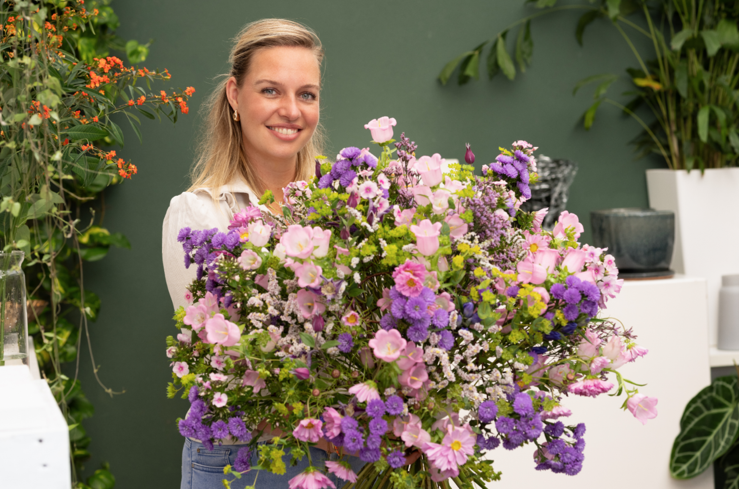 “I love to play with colour and shape in the accessories. We have colourful vases and pots that complement the flowers. Colour blocking and unexpected shapes create a global effect. A bouquet doesn't need to follow a fixed structure; I actually love to combine all kinds of flowers, even a tulip with a tropical variety. Anything goes!”