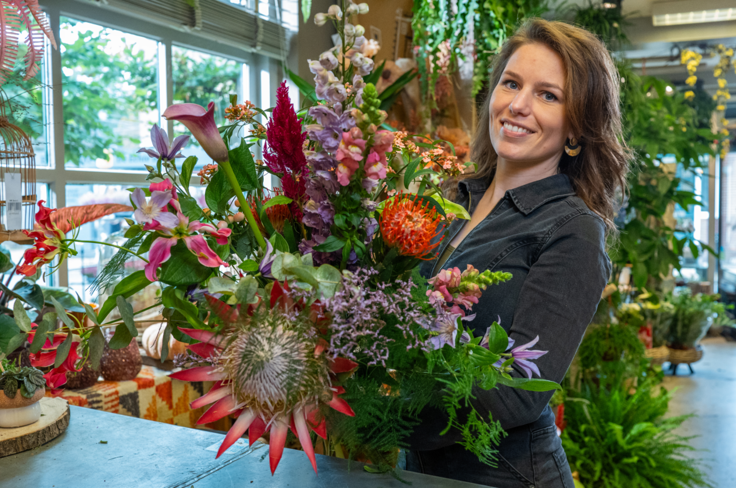 Shanna Schoone (34) runs Schoone Flowers in the Dutch town of Assendelft together with her parents. She loves working with contrasts and creating unpredictable bouquets. In the shop, she creates a global atmosphere. Are you curious how?